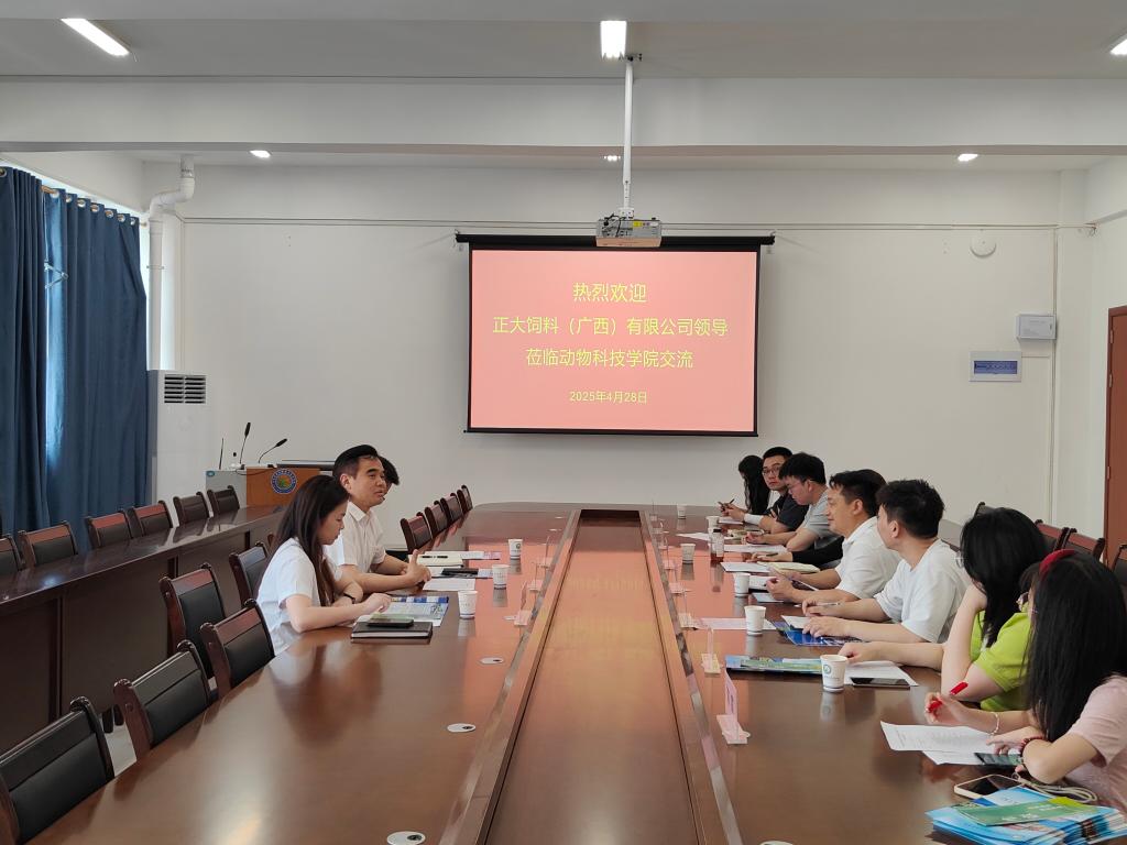 2025年4月28日,正大饲料(广西)有限公司饲料事业线资深副总裁刘槐林一行莅临我校动物科技学院,双方围绕学生实习、培养、成长,以及行业业务合作、课题研究合作和就业岗位拓展等方面展开深度友好交流,携手开启校企合作新篇章。