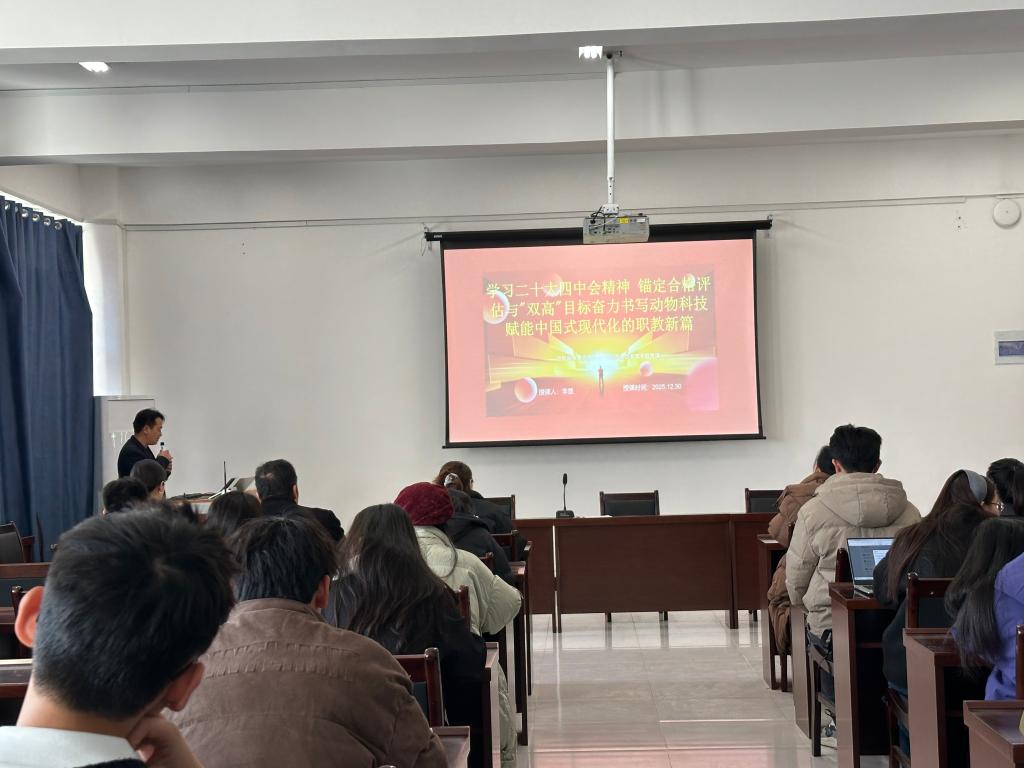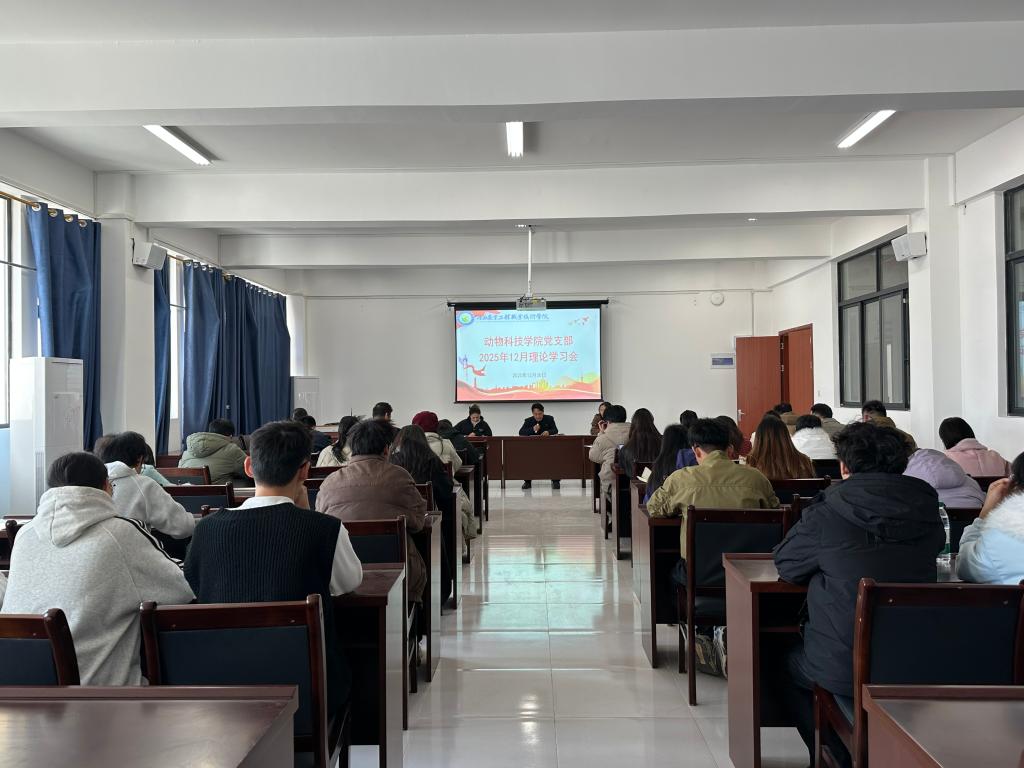 2025年12月30日下午,动物科技学院党支部围绕“营造清朗网络空间、推进自我革命、聚力‘双高’建设”主题,开展12月集中学习暨专题党课。全体党员深入学习贯彻习近平总书记在中共中央政治局第二十三次集体学习时的重要讲话精神、《推进党的自我革命要做到“五个进一步到位”》重要文章和《中国共产党党员网络行为规定》,并紧扣学院“双高”建设开展专题研讨。