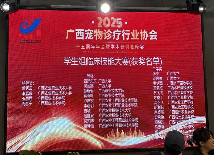 9 月 28 日,由广西宠物诊疗行业协会主办的 2025 广西宠物临床技能大赛在南宁利泰国际酒店圆满落幕。本次大赛吸引全区相关专业高校的 14 支队伍同台竞技,我校动物科技学院学子凭借过硬实力脱颖而出,在激烈角逐中斩获 2 项一等奖,为学校赢得荣誉。