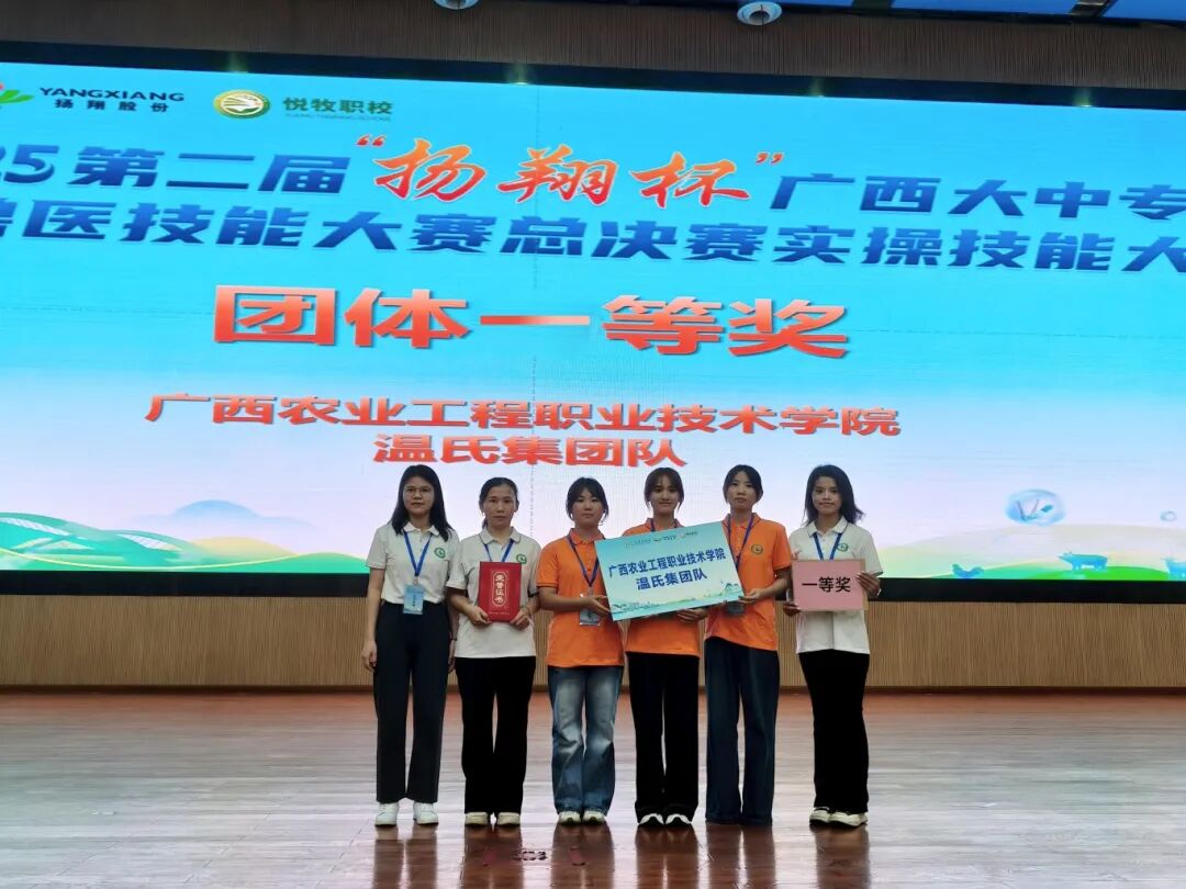 11月,2025年第二届“扬翔杯”广西大中专学生兽医技能大赛总决赛圆满落幕。我校代表队在比赛中表现卓越,由动物科技学院苏乾莲、李兰升、黄雪英3位指导老师带领的参赛团队荣获团体一等奖;参赛队员兰雪艳斩获个人特等奖,姚倩宁、韦景然夺得个人一等奖,充分展现了我校兽医专业人才培养的丰硕成果。