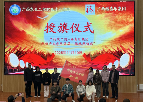 11月19日下午,我校与广西福喜乐集团合作共建的首期“福林养猪班”顺利开班。学校副校长莫嘉凌,广西福喜乐集团董事长黄定寿、总裁刘国华,广西大学教授、原广西生猪首席科学家兰干球,学校动物科技学院院长及师生代表共同出席开班仪式。
