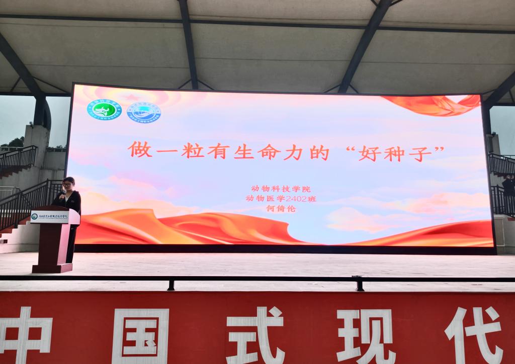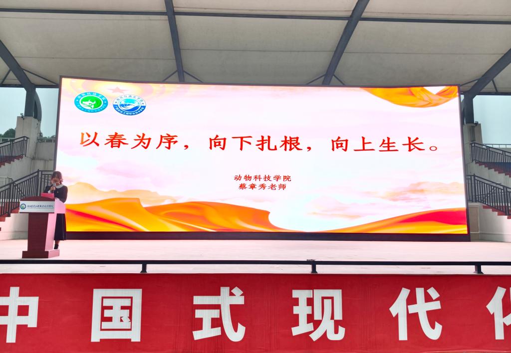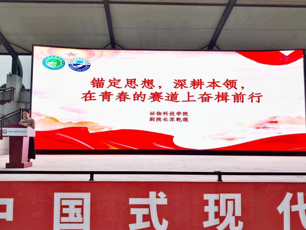 动物科技学院副院长苏乾莲在国旗下发表讲话。她寄语广大青年学子要“锚定思想,深耕本领”,并勉励同学们在青春的赛道上奋楫前行,以坚定的理想信念筑牢精神之基,以扎实的专业素养练就过硬本领,勇担时代使命,奋力书写无愧于时代、无愧于韶华的青春华章。