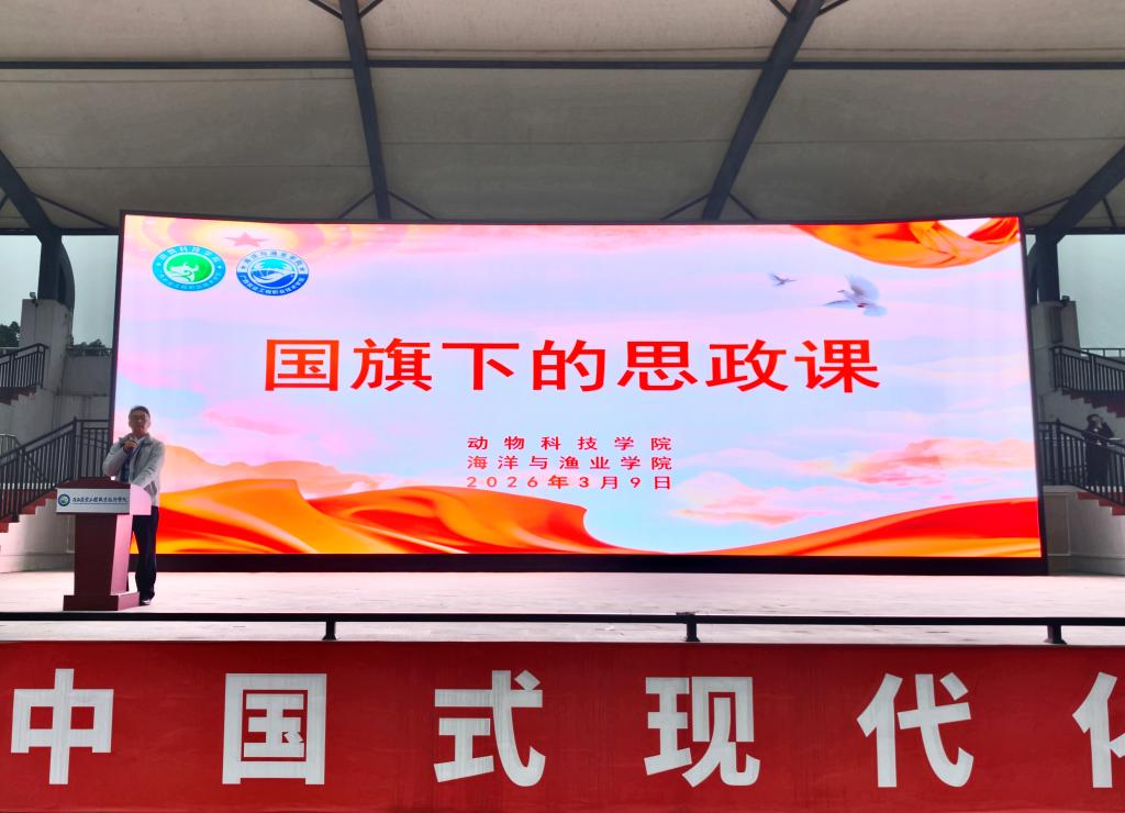2026年3月9日清晨,动物科技学院携手海洋与渔业学院在国旗下开展“开学第一课”思政教育活动。本次活动以春日为序、以国旗为引,将青年学子比作向阳生长的种子,“一粒种子,虽微小如尘,却蕴藏着破土而出的磅礴力量”,为两院学子送上新学期的成长寄语,激励青年学子如种子般扎根成长、向阳而行,在新征程上勇担使命、奋力拼搏。