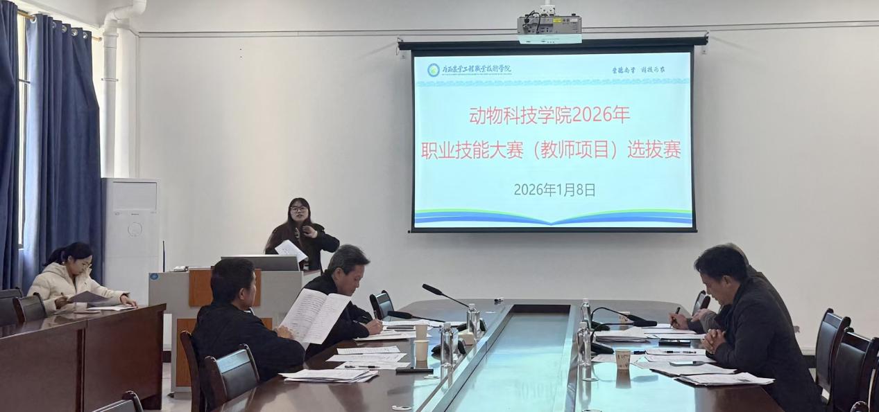 为积极备战广西职业院校技能大赛,动物科技学院于2026年1月8日下午在10栋508教室开展教师参赛项目选拔评审工作。本次选拔共征集9个参赛项目,特邀梁珠民、吴柱月等3名校外专家及学院院长李显组成评审组。