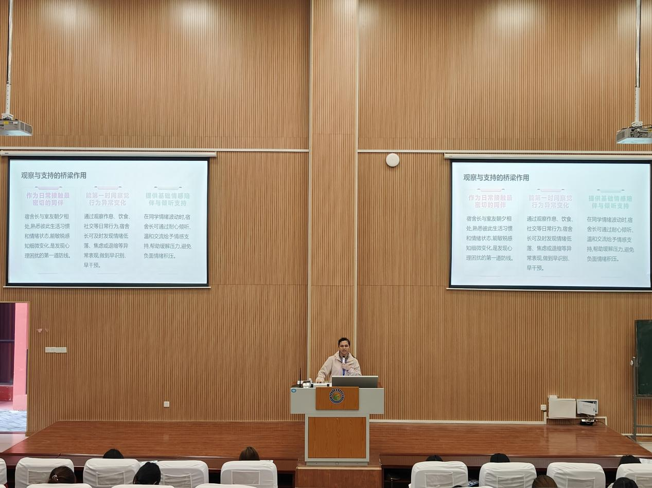 “宿舍长是室友情绪变化的‘第一观察员’,你们的一句关心、一次倾听,可能就是室友走出心理困扰的关键!”心理专干在“心理健康,你我共同守护”培训环节结合大学生生活场景为宿舍长们带来定制化心理培训,培训内容紧密围绕宿舍长职责设计,聚焦“怎么看、怎么说、怎么做”三大核心问题开展。