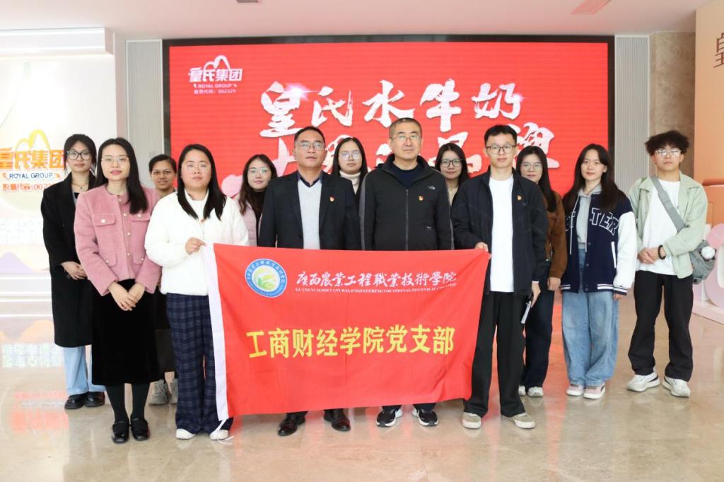 为深入贯彻职业教育产教融合、校企合作的发展理念,切实提升我院电子商务、大数据与会计等专业教学质量和学生实践应用能力,12月17日上午,工商财经学院党支部以“党建引领聚合力 访企拓岗促就业”为主题,赴广西皇氏乳业有限公司开展党日活动。学校总会计师韦炜、学院副院长范飞飞、部分党员教师参加活动。