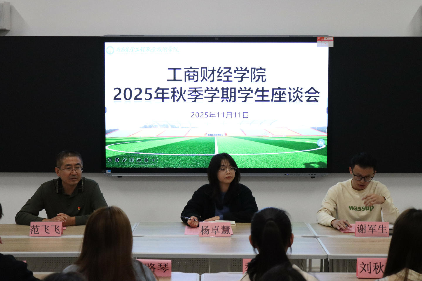 为深入了解学生的学习和生活情况,倾听学生的心声,更好地服务学生成长成才,2025年11月11日18:30,工商财经学院在4栋407会议室召开了主题为“勤学砺能·同心逐梦”的学生座谈会。工商财经学院副院长范飞飞、学工处代表杨卓慧、工商财经学院学生工作办公室干事谢军生、工商财经学院全体辅导员以及来自24、25级大数据与会计、电子商务、供应链运营专业的学生代表参加座谈会。