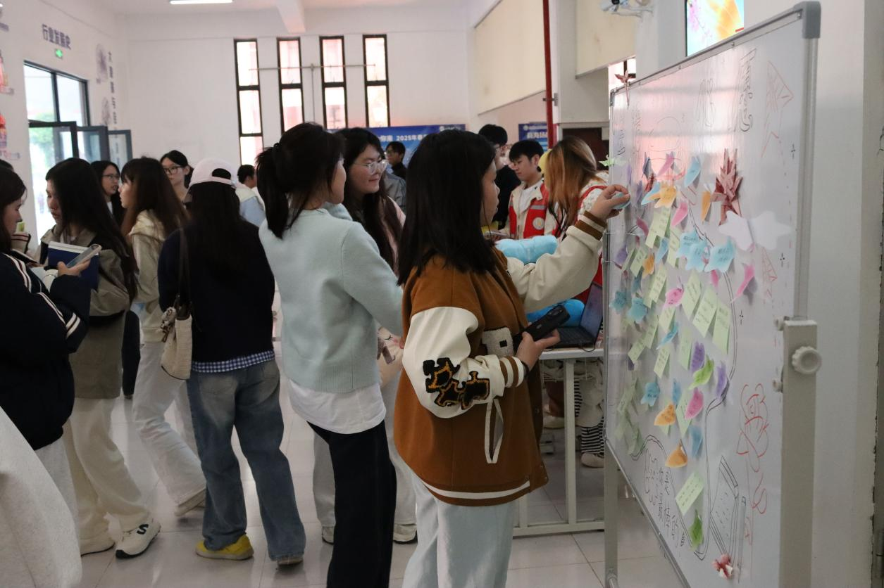 室内的“星语心愿”留言板前,汇聚了满满的温情,同学们将心愿、期许与自我鼓励写在彩色便签上,贴满了手绘的星星罐子,一句句暖心标语,让驻足的学生感受到悦纳自我的力量,也为彼此留下了温暖的心理支持。
