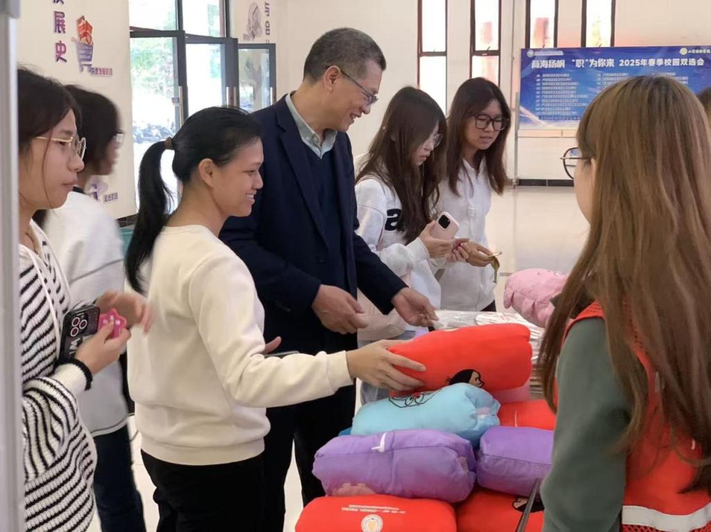 除了趣味体验,活动还设置了兑换礼品区,工作人员准备了团扇和暖手抱枕,同学们围在一起挑着自己心仪的小礼品,定格下这场心灵之旅的美好瞬间。领导老师们也参与其中,与学生亲切互动,倾听他们的想法,为活动增添了浓浓的人文关怀。