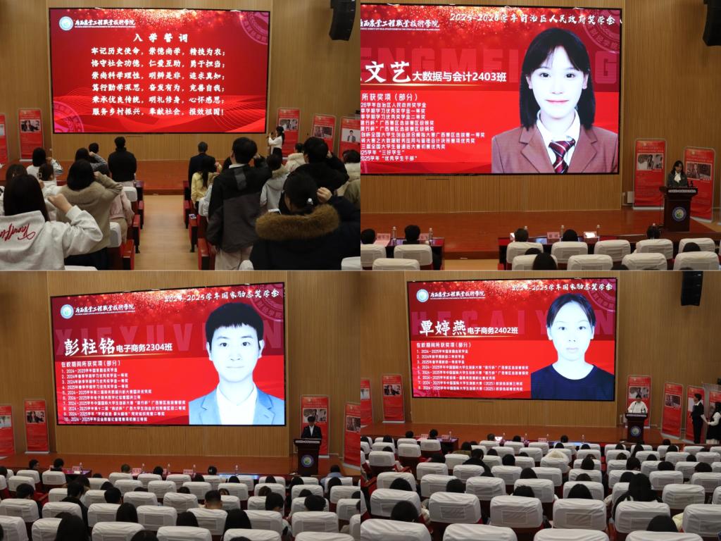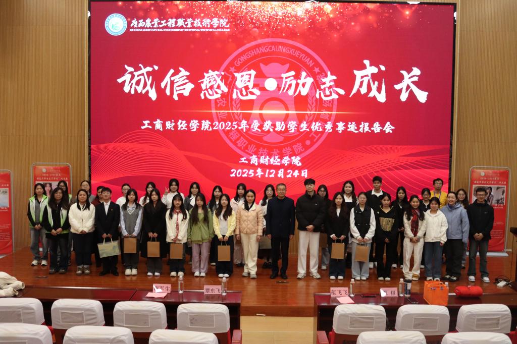 2025年12月24日,工商财经学院受奖助学生优秀事迹报告会在2号阶梯教室如期举行。学院负责人、学生工作处代表与180余名师生齐聚一堂,共赴这场关于成长、感恩与梦想的青春盛会。