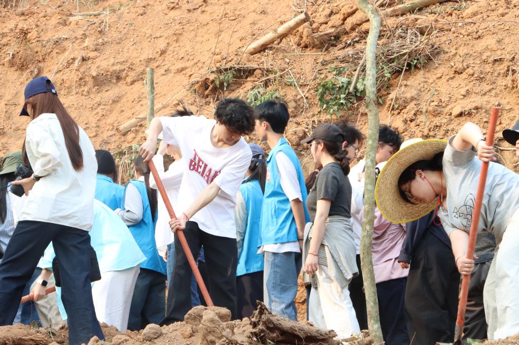和煦的春风里,大家脸上洋溢着劳动的喜悦,一棵棵树苗在师生的共同努力下稳稳扎根山坡,成为校园里一道崭新的绿色风景线。