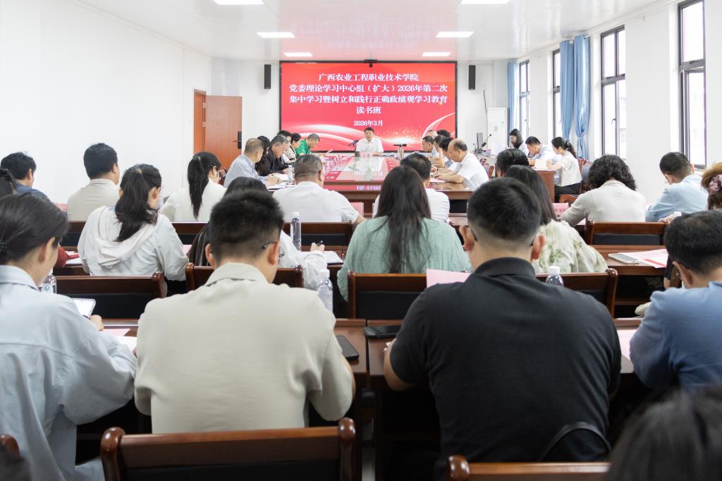 为进一步学习贯彻习近平总书记关于树立和践行正确政绩观的重要论述,认真学习领会习近平总书记在全国两会期间的重要讲话精神和全国两会精神,3月27日,学校开展党委理论学习中心组(扩大)2026年第二次集中学习暨树立和践行正确政绩观学习教育读书班。学校党委书记马敏,副校长李祖培、莫嘉凌,总会计师韦炜参加学习。各部门、二级学院负责人,各党支部书记、支委,各二级学院组织员列席旁听。