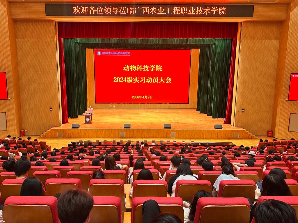 为扎实推进实践育人工作,保障实习教学规范有序开展,4月9日晚,我校动物科技学院在学术交流中心召开2024级学生实习动员大会。学校副校长莫嘉凌出席会议,教务处、招生就业处相关负责同志,动物科技学院客座专家吴柱月、全体教职工,合作企业桂林力源集团兽医总监代科及动物科技学院2024级全体学生参加会议。