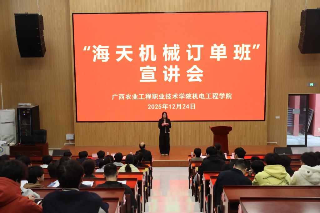 12月24日,“海天机械订单班”宣讲及面试活动在我院成功举行,标志着我院与这一全球高端装备制造领军企业的产教融合进入实质性共建阶段。机电工程学院副院长陈宏昌、海天集团华南区域经理张小明等校企双方代表出席,相关专业师生共同参与。