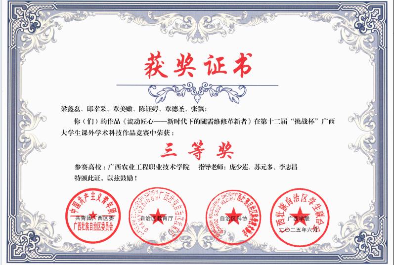 近日,第十二届 “挑战杯” 广西大学生课外学术科技作品竞赛获奖名单正式公布,我校以 25 项奖励、100% 获奖率的卓越成绩刷新历史纪录,其中一等奖 2 项、二等奖 7 项、三等奖 16 项,充分展现了我校学子的科创实力。