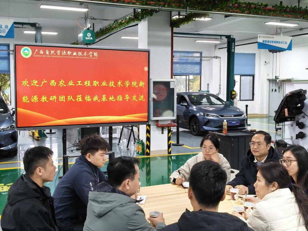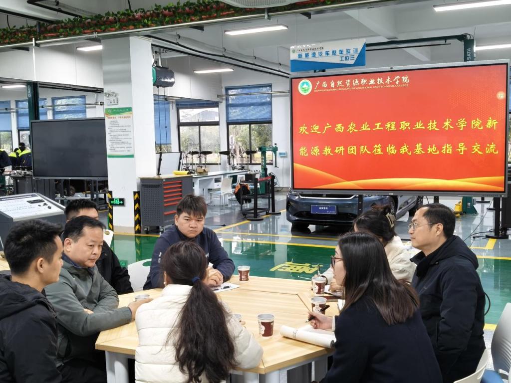 2025年11月19日,机电工程学院新能源汽车检测与维修技术教研室主任郑冰松一行前往广西自然资源职业技术学院机电工程学院新能源汽车检测与维修技术融创教学团队(以下简称融创团队)开展交流学习活动。双方围绕人才培养模式创新、实训教学、学生实习、技能比赛等核心议题进行了深入探讨。