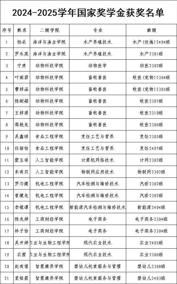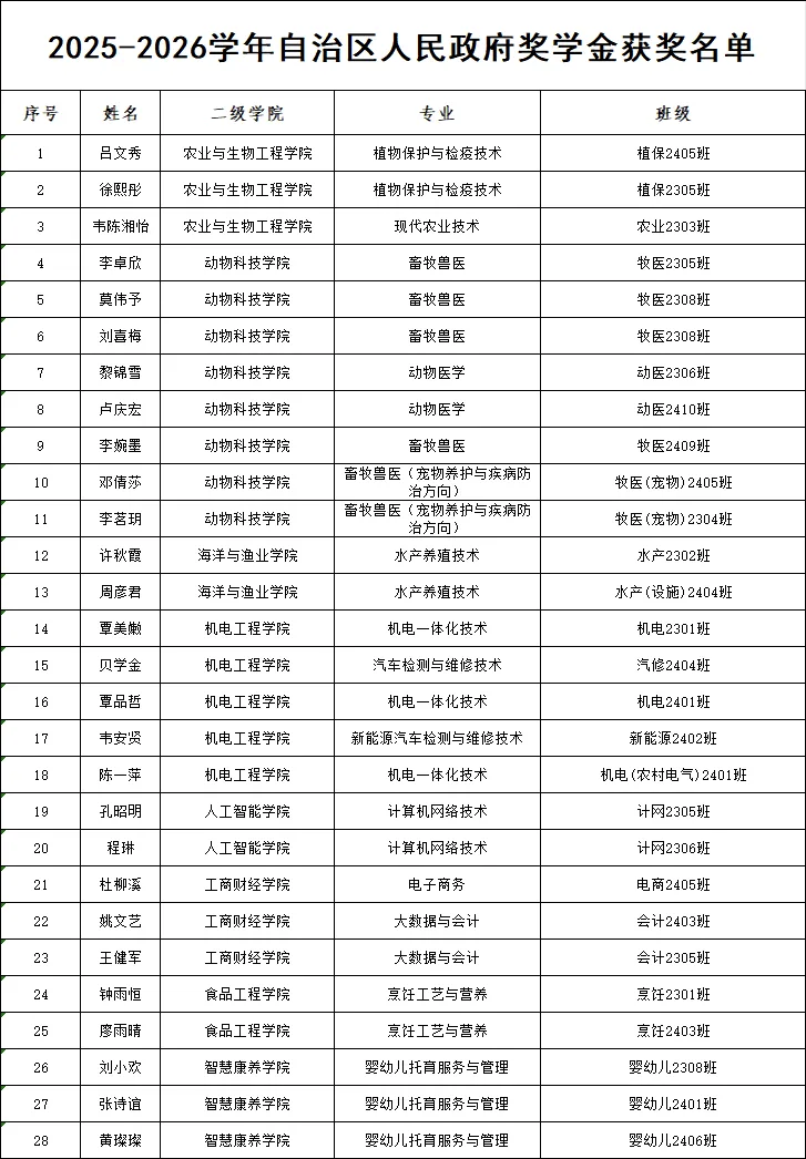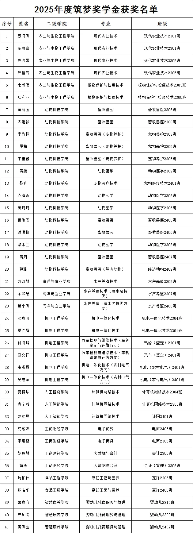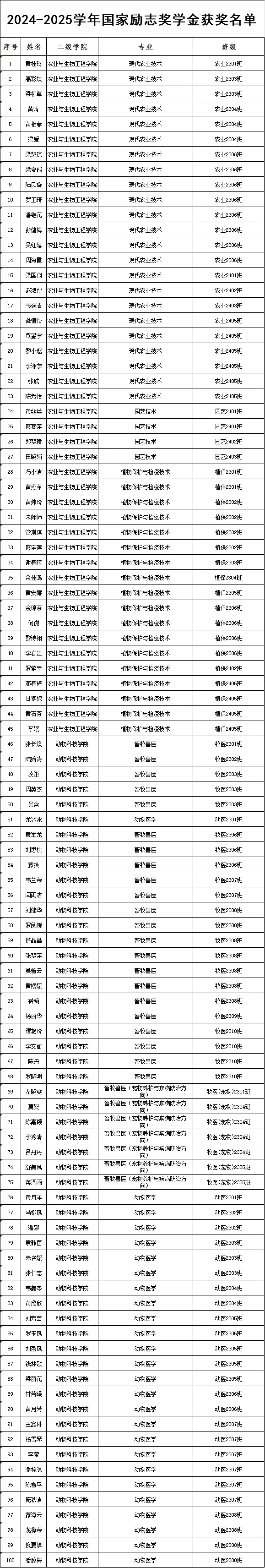 我校始终坚持落实立德树人根本任务,高度重视榜样引领的育人价值,不断完善“奖、助、贷、勤、补、免”全方位资助体系,在确保评审公平公正公开的同时,着力构建物质帮扶、道德浸润、能力拓展、精神激励深度融合的长效机制,通过优秀学子事迹报告会、获奖学生风采展等多种形式,以典型引领风尚,以榜样激励成长。希望全体同学以他们为榜样,在“崇德尚学 精技为农”校训精神的引领下,将个人成长融入时代发展,用勤奋书写青春,以技能报效家国,共同谱写新时代职业教育的奋进篇章。