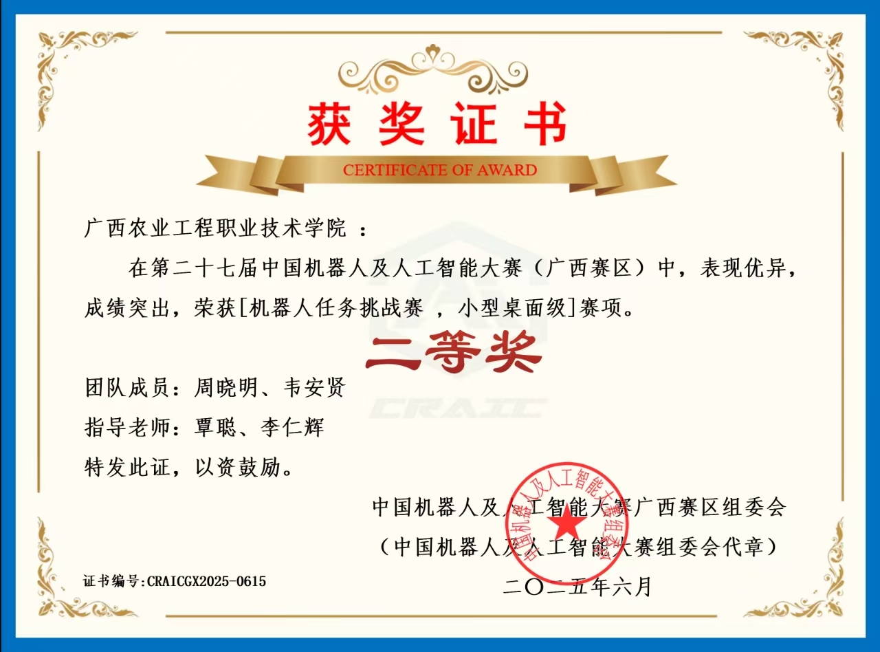 覃聪,中共党员,副教授,高级技师,高级“双师型”教师,广西农业工程职业技术学院学术带头人,机电一体化教研室主任,现代农业装备应用技术专业负责人,自治区直属机关优秀教师,自治区职业技能竞赛裁判员专家库成员。出版教材5本,发表论文15篇,主持重点课题3项,参与自治区课题17项,实用新型专利8项。全区教师技能大赛三等奖,全国高校人工智能教师创意竞赛(广西赛区)二等奖1项,三等奖两项。指导学生技能大赛、大学生创新创业大赛等获国家级二等奖2项,自治区级一等奖3项,二等奖6项,三等奖15项。