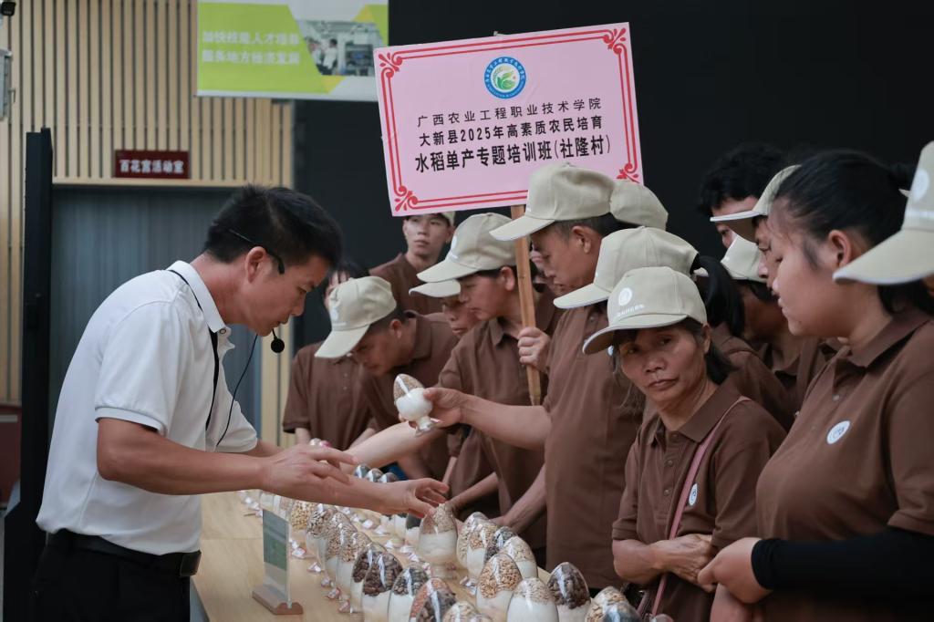 2025 年9月22日,我校精心组织“大新县2025年上育村、社隆村高素质农民培育水稻单产提升专题培训班”“大新县 2025 年高素质农民培育农机手专题培训班”的107名学员,分别各自前往广西田园生化股份有限公司、八桂田园、广西农业科学院蔬菜研究所等地开展现场观摩、教学与交流活动。