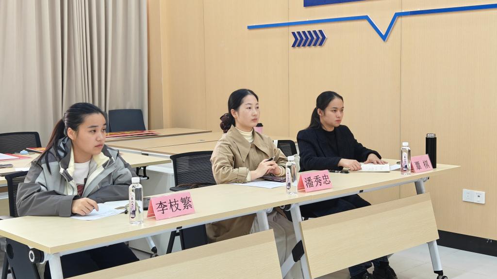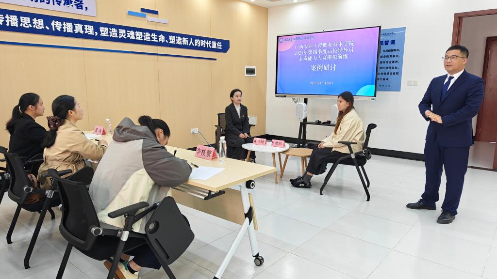 为全面提升思想政治工作队伍的专业素养与实战能力,12月30日,由学校“薪火”辅导员工作室主办、我院承办的2025年第四季度辅导员素质能力大赛模拟演练顺利举行。活动聚焦案例研讨与谈心谈话两大核心环节,池品妤、韦晓悦两位老师作为代表进行现场演练,充分展现了新时代思政工作者的精神风貌与育人本领。
