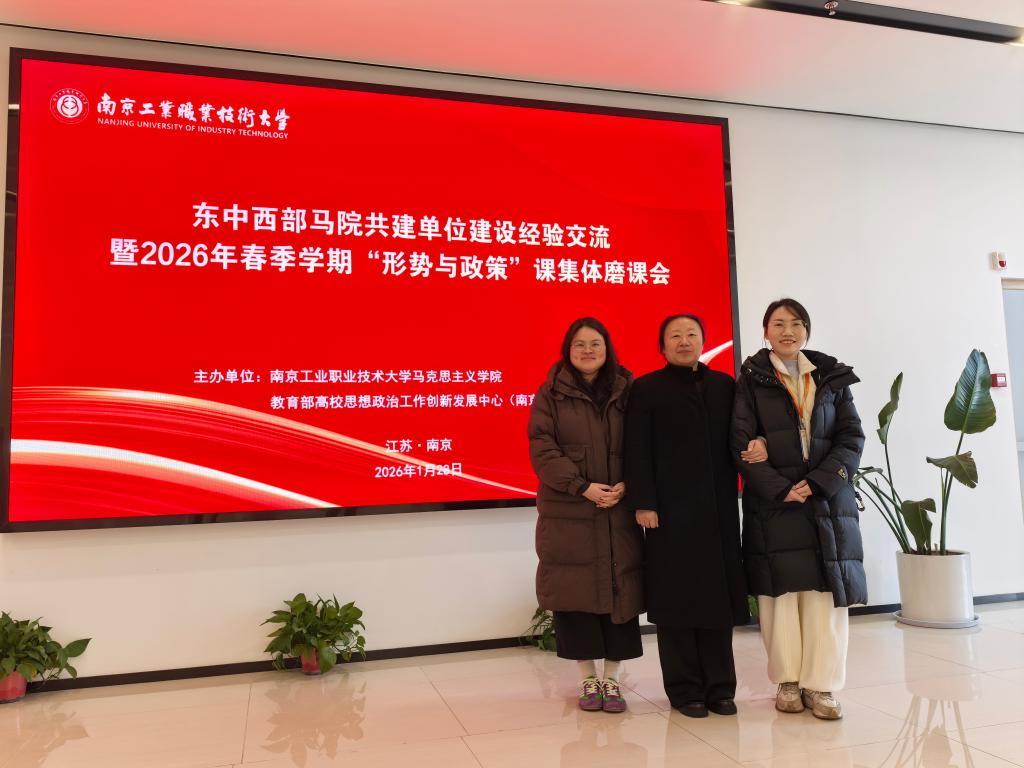 2026年1月28日至30日,南京工业职业技术大学马克思主义学院与教育部高校思想政治工作创新发展中心(南京工业职业技术大学)联合主办的东中西部马院共建单位建设经验交流暨2026年春季学期“形势与政策”课集体磨课会在南京成功举办。此次活动吸引了来自内蒙古、吉林等9个省区市及新疆生产建设兵团共17所院校的100余位教师参与。我校由马克思主义学院院长石立波带队,一行三人参加了此次盛会。