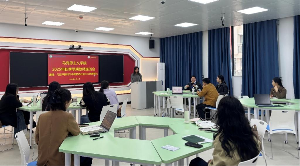 2025年11月11日,《习近平新时代中国特色社会主义思想概论》教研室在2号教学楼5楼智慧教室召开2025年秋季学期教师座谈会。马克思主义学院副院长潘秀忠出席会议,教研室全体授课教师参加会议。会议由教研室主任吴珊珊主持。