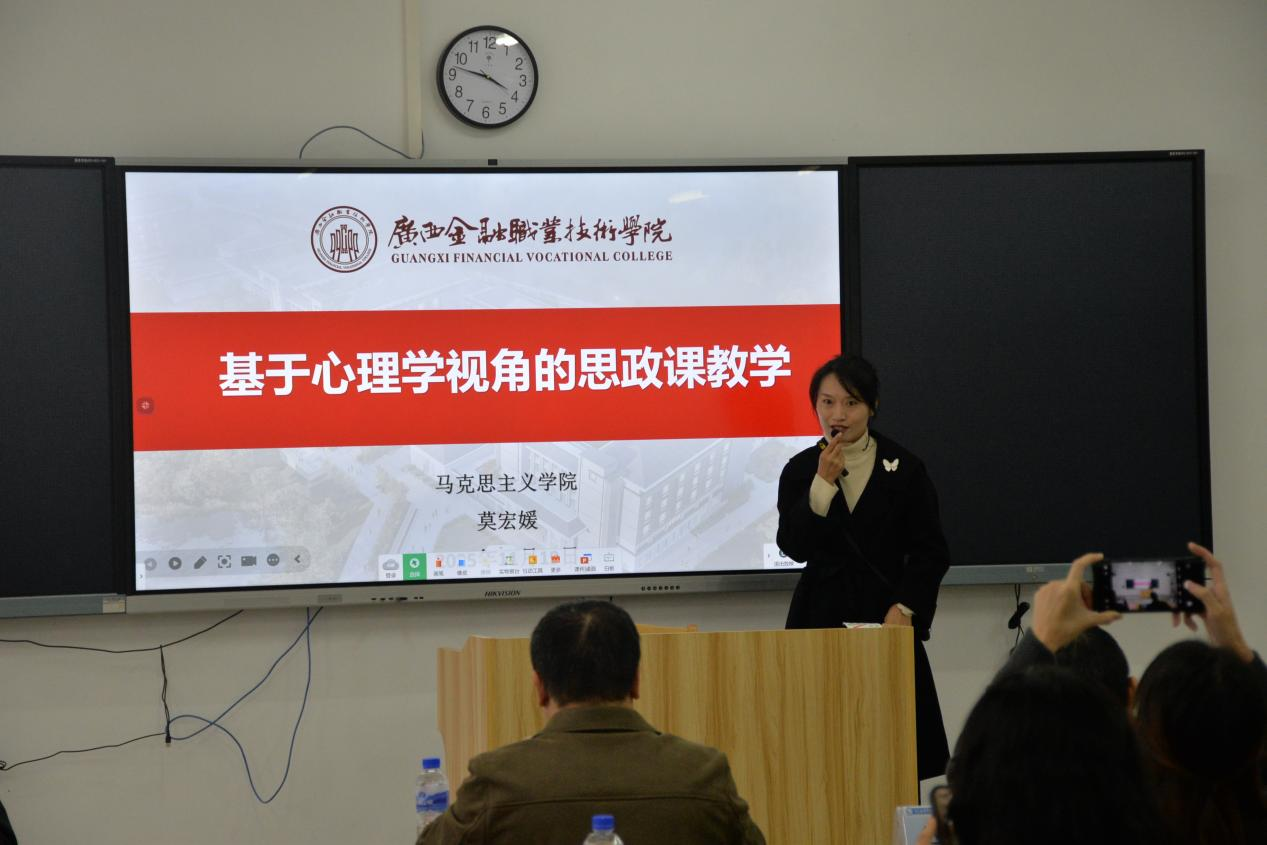 当日下午,活动转至百色职业学院,开展示范课展示与集体备课座谈。广西电力职业技术学院陈宇怡老师以“国家安全”为主题,通过案例教学与互动问答,引导学生理解“国家安全人人有责”的深刻内涵;广西金融职业技术学院莫宏媛老师从心理学视角出发,分享如何运用认知与积极心理学理论优化思政课教学设计,为提升课堂吸引力提供新思路。