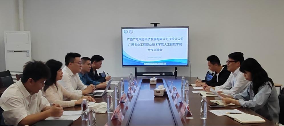 2026年3月23日,广西广电网络科技发展有限公司扶绥分公司总经理朱晨曦一行到访广西农业工程职业技术学院人工智能学院,就深化校企合作事宜开展交流。人工智能学院负责人江咏海及相关人员出席座谈会。