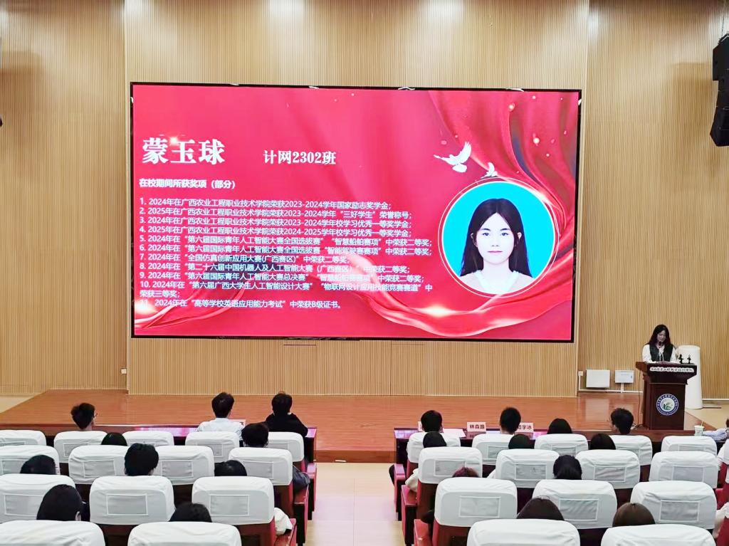 随后,三位优秀受奖助学生代表依次分享她们的成长故事和奋斗历程。国家奖学金获得者蒙玉球分享了自己从实训室到技能大赛领奖台的成长历程;自治区人民政府奖学金获得者程琳展示了高效时间管理和服务同学的担当精神;励志奖学金获得者黄月兰用诠释了逆境中的坚韧与追求;她们用真实经历传递信念,以青春之声激扬奋进力量,赢得现场阵阵掌声。