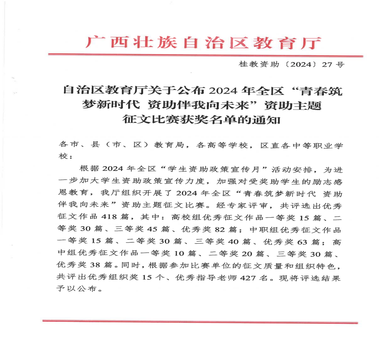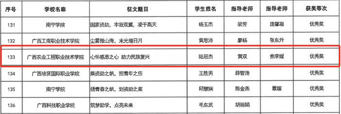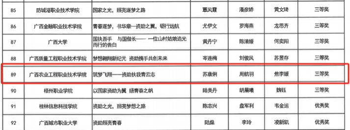 为贯彻落实《自治区教育厅关于开展2024年全区“学生资助政策宣传月”活动的通知》(桂教资助〔2024〕7号)文件精神,我校在全校范围内举办了以“青春筑梦新时代 资助伴我向未来”为主题的资助征文比赛。比赛遵循优中选优的原则,经过组织推荐和评选,选送两篇优秀作品至自治区教育厅参赛。最终,人工智能学院苏康俐同学的《筑梦飞翔——资助扶我青云志》荣获三等奖,海洋与渔业学院陆冠杰同学的《心怀感恩之心 助力民族复兴》荣获优秀奖。