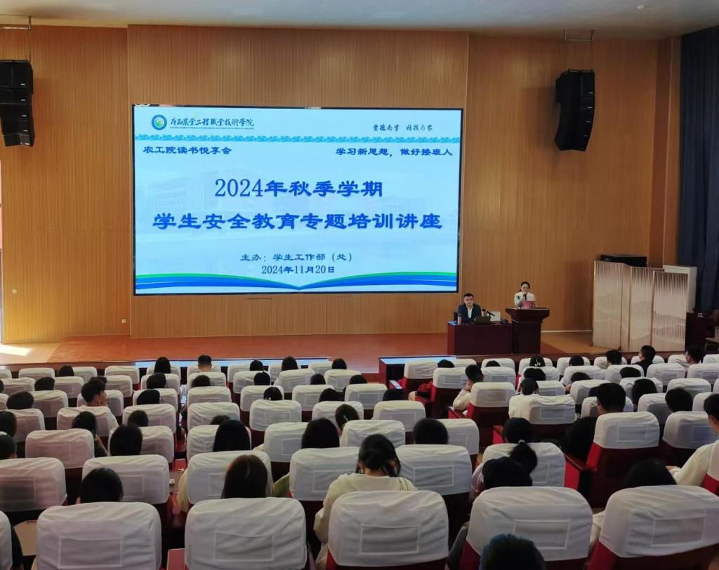 11月20日下午,我校在1号梯形教室举办2024年秋季学期学生安全教育专题培训讲座,学校辅导员代表和在校生代表约240人参加。