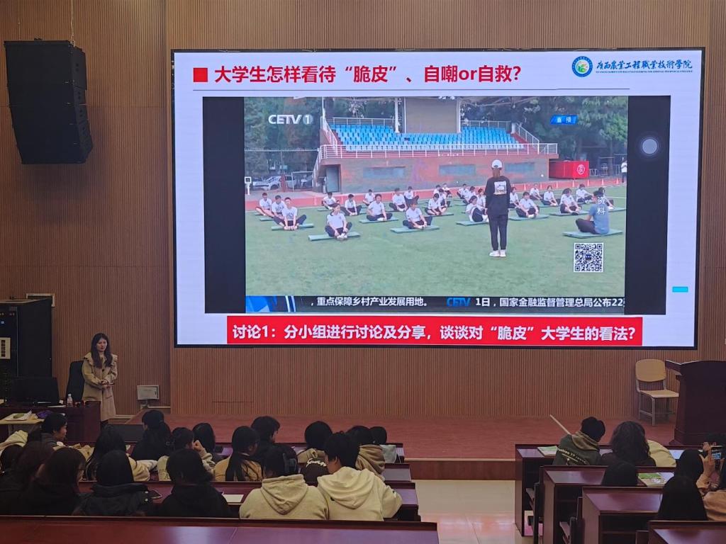 池品妤老师以《拯救“脆皮”学生,淬炼硬核青春》为班会主题,以本班学生的生活作息情况为切入点,通过游戏互动以及分组讨论方式,揭示部分大学生沉迷手机、熬夜刷剧、缺乏运动的现象。同时通过分享00后青年榜样的力量,鼓励学生制定合理的作息时间,积极参与体育锻炼,告别“脆皮”生活,展现大学生良好的精神风貌。