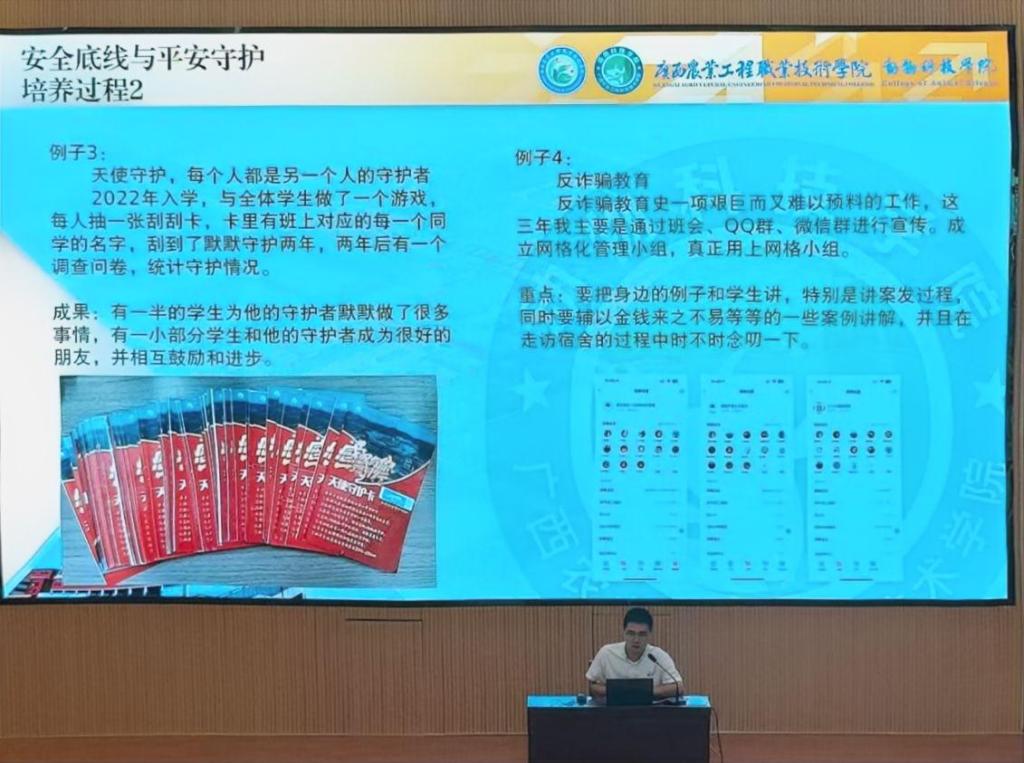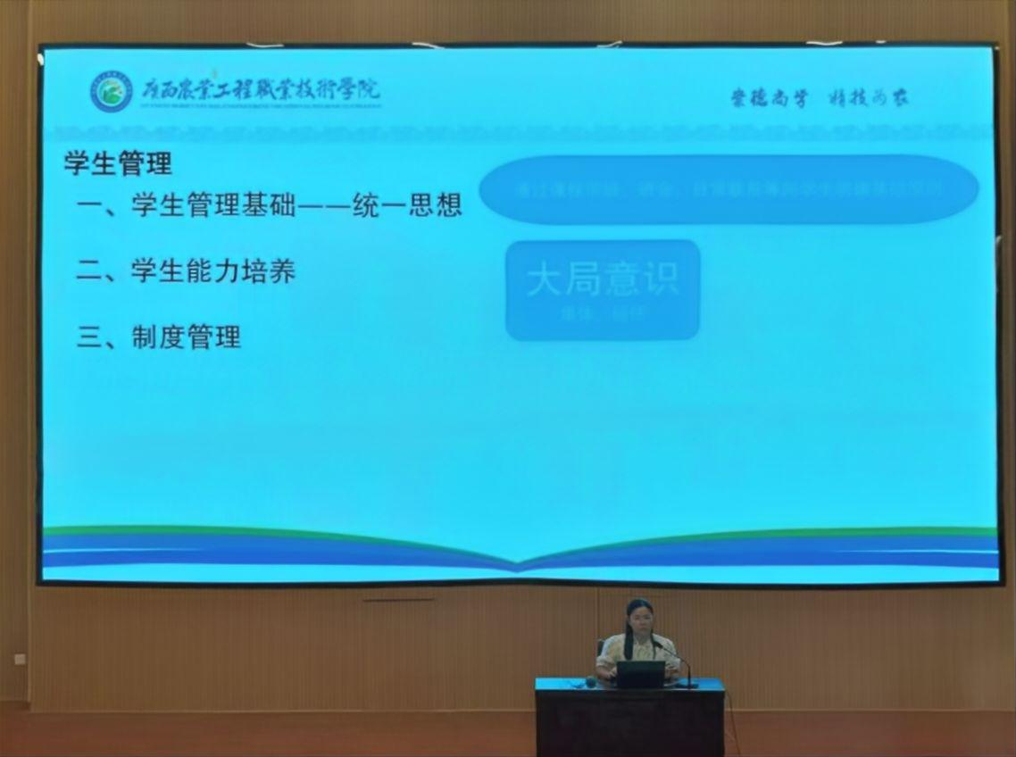在学生管理工作专题培训中,邀请了广西建设职业技术学院副教授冯光帆作题为《聚焦职责使命,提升素质能力——新时代高职学生工作的思路与举措》的专题讲座。冯光帆结合其十二年学生工作实践与研究成果,从“思政引领、精准赋能、机制革新”三个维度,系统阐释了新时代高职院校学生工作的职业属性、实践路径与发展逻辑,内容兼具理论深度与实践指导价值,为参训人员提供了可借鉴、可操作的工作范式。