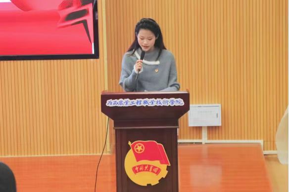 新团员代表蒋燕琳同学在会上发言,总结了自己过去的学习和生活表现,并表示今后会更加坚定理想信念、勤学苦练本领,践行团员初心和使命。